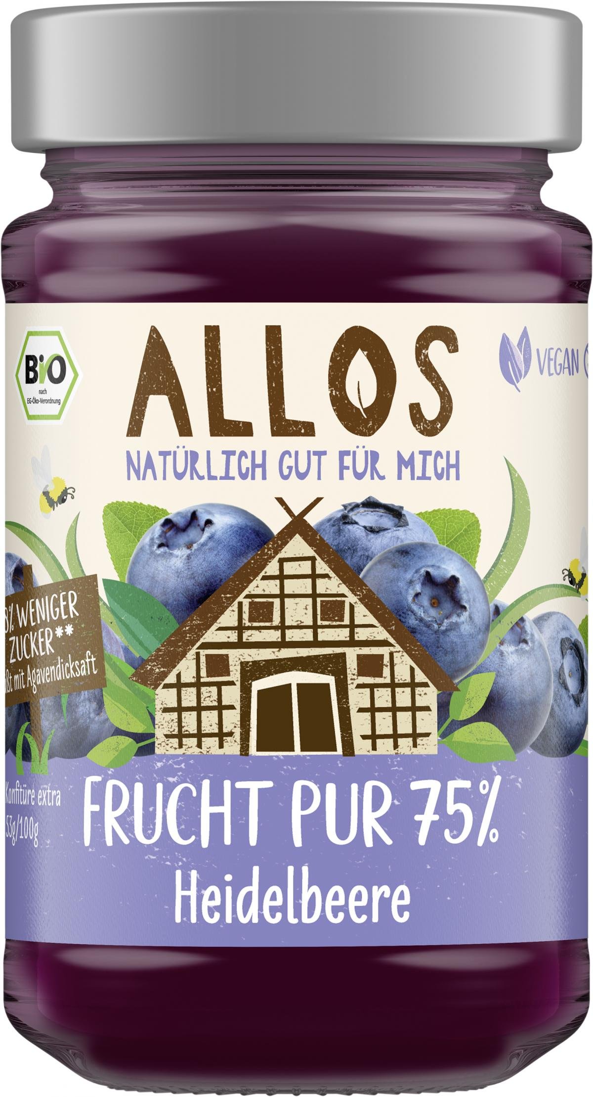 Heidelbeeren* (75%), Agavendicksaft* (22%), Geliermittel: Pektine, Festigungsmittel: Calciumcitrate, Zitronensaftkonzentrat*.