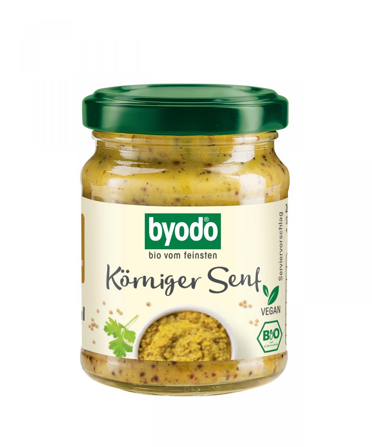 weniger anzeigenDer mittelscharfe, körnige Bio-Senf von Byodo schmeckt wunderbar pur zu Wurst und Käse. Salatdressings geben die ganzen Körnern des Bio-Senfes feinen Biss, eine leckere Würze und Sämigkeit. Auch zu Kartoffelgerichten wie z.B, gefüllten Ofenkartoffeln ist der Byodo Körniger Senf zu empfehlen.