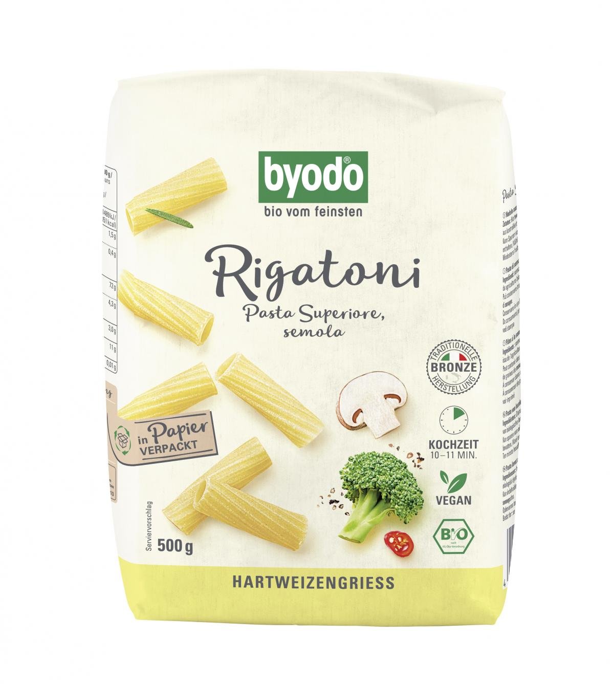 Die Rigatoni, semola von Byodo werden aus feinstem italienischen Bio-Hartweizengrieß hergestellt. Die hellen Nudeln haben einen tollen Biss.