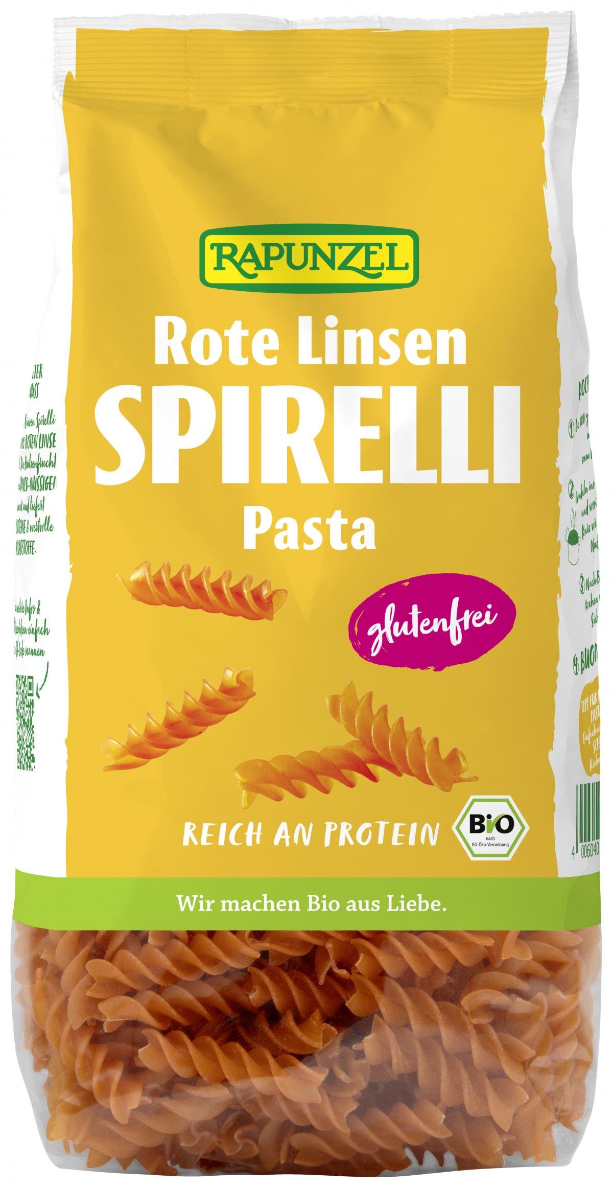 Rapunzel Rote Linsen Spirelli werden aus 100% roten Linsen hergestellt. Die Hülsenfrucht sorgt für den mild-nussigen Geschmack und liefert viele Proteine & wertvolle Ballaststoffe. Die Spirelli sind die ideale glutenfreie Alternative zu herkömmlicher Getreide-Pasta.