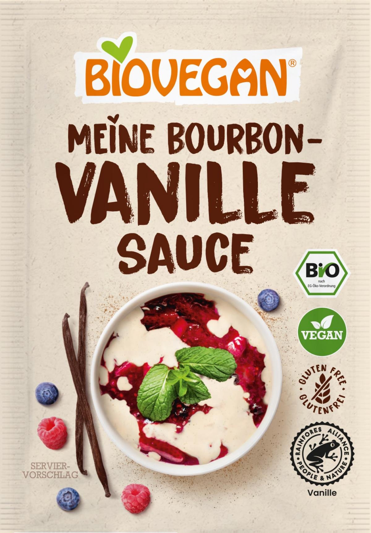 Vanille Sauce mit Bourbon-Vanille. Die Vanille Sauce kann zu Desserts, Apfelstrudel, Eis und frischen Früchten serviert werden. Sie ist warm und kalt genießbar.